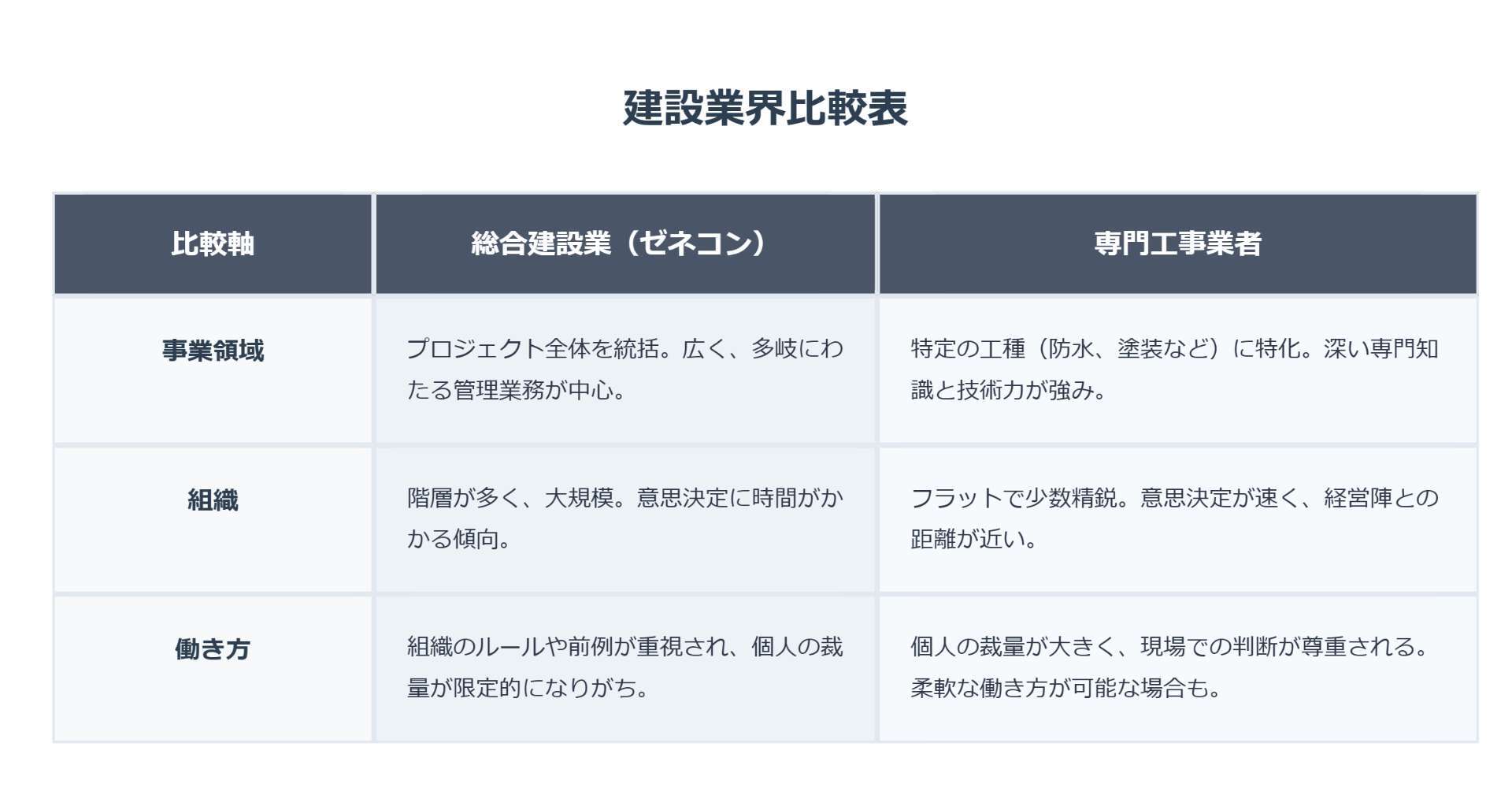 「事業領域」「組織」「働き方」で比較するゼネコンと専門業者の違い